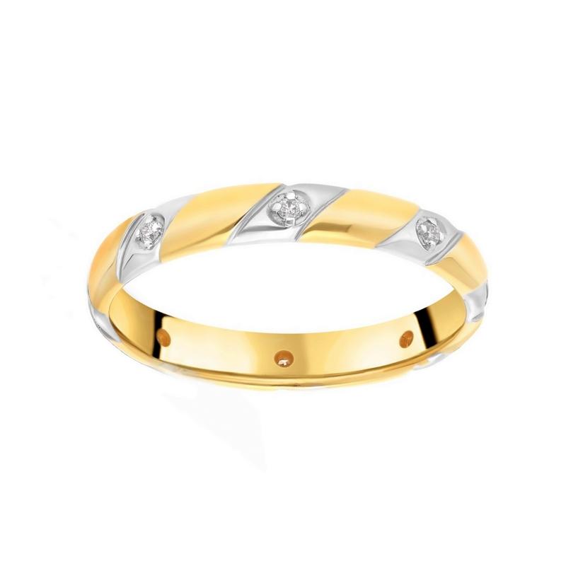 Élégance et Raffinement s’Unissent dans cette Alliance en Or Jaune et Blanc 750, où la Délicatesse des Diamants Rencontre l’Harmonie d’une Finition Polie pour un Éclat Subtil et Intemporel.