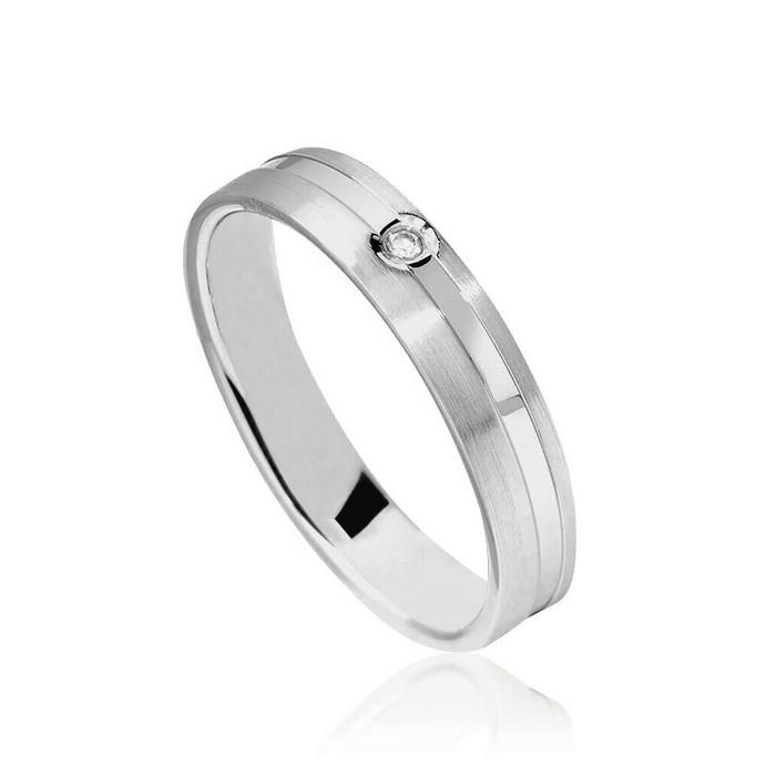 Découvrez Cette Alliance Mixte en Or Gris 750 Palladié et Rhodié. Sa Finition Brossé et Polie Met en Valeur un Diamant Naturel de 0.017 Carat en Qualité HSI.