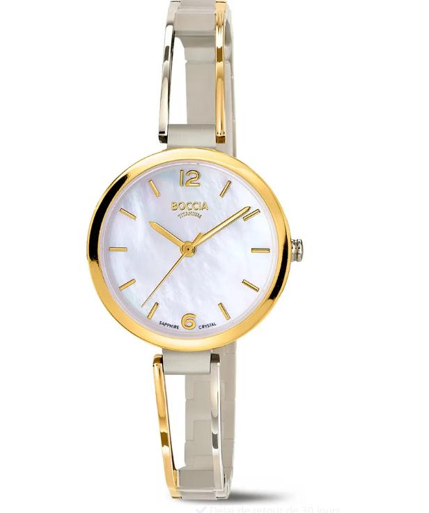 Montre Boccia Femme Ronde Bicolore en Titane PVD Jaune Mat et Poli, Cadran en Nacre Blanche et Verre Minéral Saphir. Diamètre de la Boîte : 30 MM. Titanium Anti-Allergique et Léger. Mise à Taille et Livraison Offertes en France Métropolitaine et en Corse. Bijouterie Cupillard Belfort Distributeur Officiel des Montres et Bijoux en Titane Boccia. 3354.01