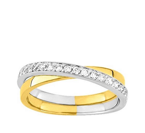 Alliance de mariage femme croisée bicolore or jaune et or gris palladié 750/1000 (18 carats) diamants naturels, Girard.