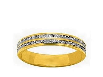 Alliance de mariage Girard pour femme effet diamanté bicolore de 3.5 mm de large en or jaune poli et or gris palladié rhodié 750/1000 (18 carats) avec des motifs ciselés polis sur deux rangs.