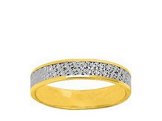 Alliance de mariage femme effet diamanté bicolore de 4 mm de large en or jaune poli et or gris rhodié 750/1000 (18 carats) avec motifs ciselés polis Girard.