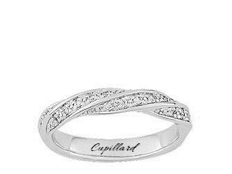 Alliance de mariage femme torsadée créative, diamants naturels sertis grains en or gris 750/1000 (18 carats) palladié et rhodié, Girard.