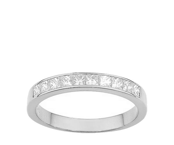 Demi alliance diamant naturel princesse serti rail en or gris palladié et rhodié 750/1000 (18 carats), composée de 10 diamants carrés pour un poids total de 0,70 carat en couleur H et pureté SI, Girard.
