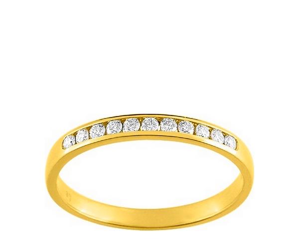 Demi alliance femme diamant naturel serti rail en or jaune 750/1000 (18 carats), sertie de 11 diamants naturels pour un poids total de 0,15 carat de diamants de couleur H et de pureté SI.