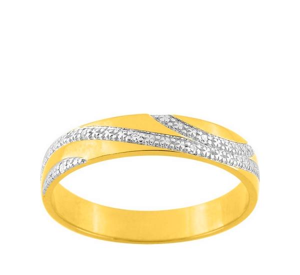 Alliance de mariage femme créative bicolore or jaune et or blanc palladié 750/1000 (18 carats) sertie de diamants naturels, Girard.