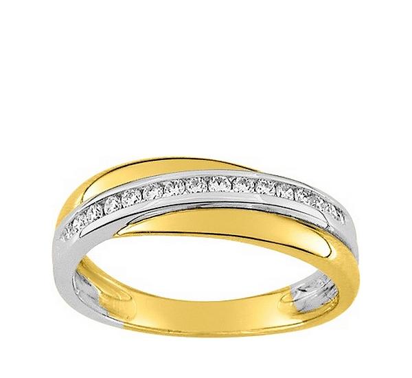 Alliance de mariage femme croisée en or jaune et or blanc palladié 750/1000 (18 carats) sertie de diamants naturels, Girard.