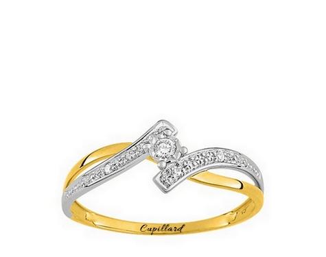 Bague femme diamant naturel solitaire accompagné or bicolore jaune et or gris rhodié 750/1000 (18 carats).