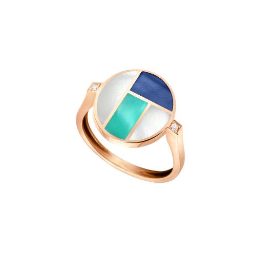 Cette Bague Ovale en Or Rose 750/1000 Séduit par son Design Géométrique Moderne et ses Incrustations Colorées. Son Plateau Rond Associe Trois Nuances Harmonieuses : Bleu Profond, Turquoise Lumineux et Blanc Nacré. Découvrez Également le Collier Assorti Ainsi qu’une Seconde Bague Coordonnée, Pour Composer un Ensemble Harmonieux et Élégant.