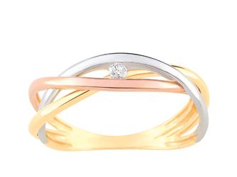 Moderne et actuelle, vous aurez plaisir à porter cette magnifique bague trois fils croisés en or jaune, or rose et or gris rhodié 750/1000 (18 carats) solitaire diamant naturel 0.04 carat serti rail.