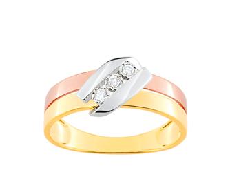 Bague femme tricolore en or jaune, or rose et or gris rhodié 750/1000 (18 carats) Trilogie diamants pastillés sertis rail, (0.054 carat au total en qualité H-P1),