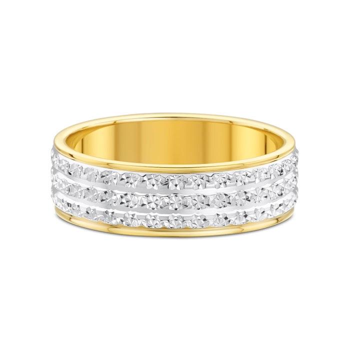 Alliance de mariage Faibelle pour femme à effet diamanté bicolore en or jaune poli et or gris palladié rhodié 750/1000 (18 carats) avec des motifs ciselés polis sur trois rangs.