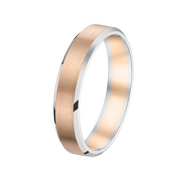 - Alliance ruban plate or bicolore, or rose brossé au centre avec des biseaux en or blanc brillant sur les cotés.