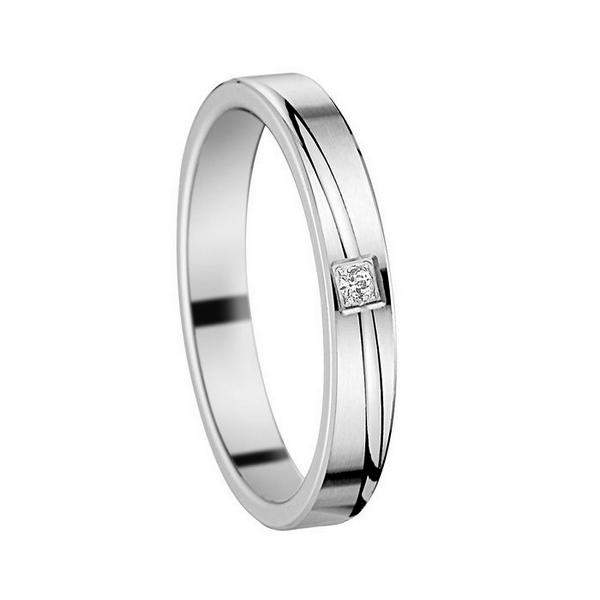 Cette Alliance en Or Blanc 750 Palladié et Rhodié, Ornée d’un Diamant de 0.017 Carat (Qualité HSI). Sa Finition Brossée Apporte une Touche d’Élégance Discrète, Parfaite pour Célébrer un Union.