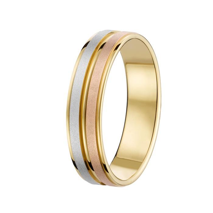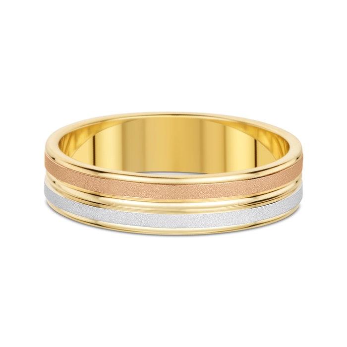 Alliance femme Tricolore en or jaune poli, or gris palladié rhodié et or rose sablé 750/1000 (18 carats), Fairbelle.