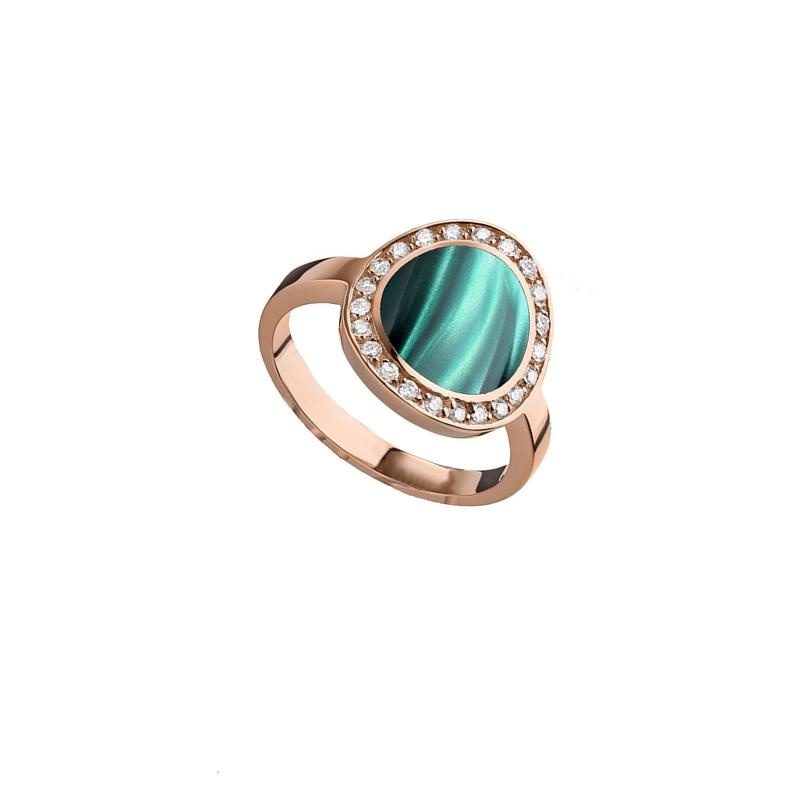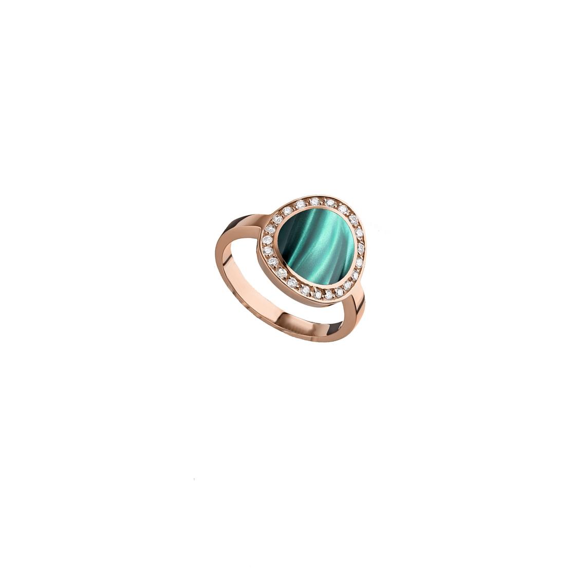 Splendide bague pour femme en or rose 750/1000 (18 carats) du créateur Français Alain Clozeau, de la ligne Mikado, en résine nacrée Vert Bronze, sertie de diamants naturels.