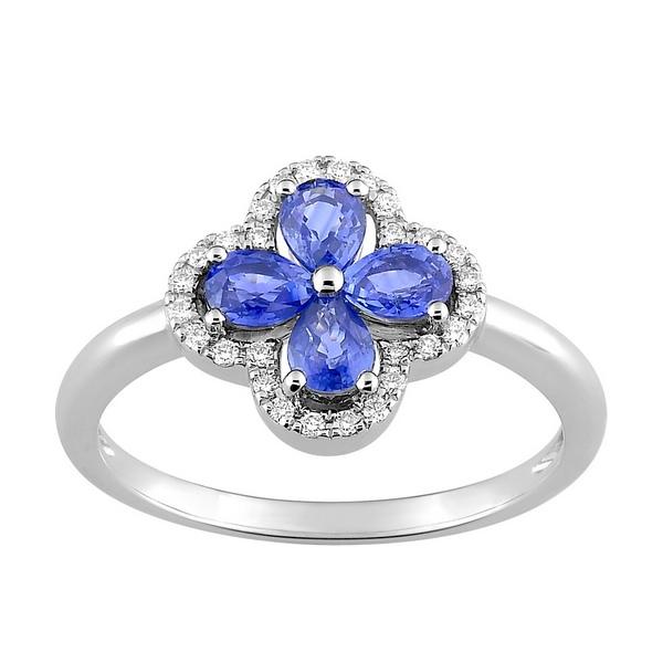 Sublime bague en forme de Trèfle sertie de quatre saphirs de Ceylan poire pour un poids total de 0,81 carat environ, accompagnés de diamants naturels sertis griffes 0.11 carat au total qualité H-SI, sur une monture en or gris rhodié 750/1000 (18 carats).
