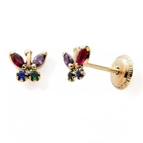 Boucles d'Oreilles pour Fille à Motif Papillon en Or Jaune 375/1000 (9 Carats) Serties d'Oxydes de Zirconium Teintés (Rouge, Violet, Vert et Bleu), Fermoir à Vis.