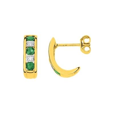 Demi Créole Femme Or Bicolore 750/1000 (18 Carats) Serties Trois Émeraudes Rondes Naturelles et de Deux Diamants Naturels (0.02 Carat au Total) sur Chaque Boucle d'Oreille.