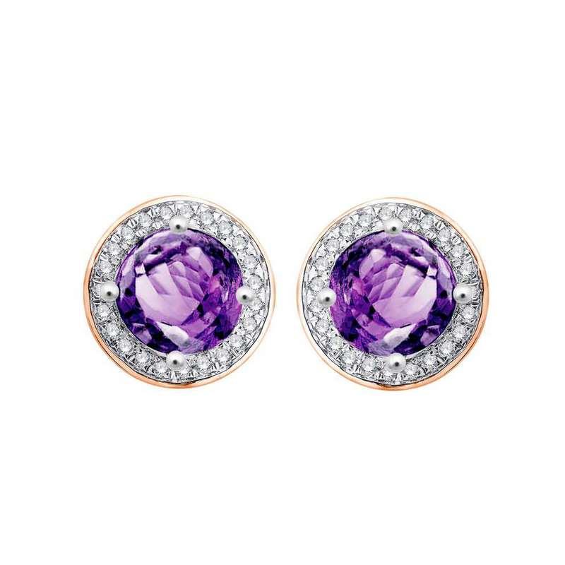 Boucles d'Oreilles Améthystes Rondes Monture 4 Griffes en Or Rose 750/1000 (18 carats) Diamants Naturels (0.12 Carat au Total).