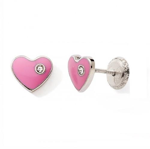 Boucles d'oreilles à vis en argent 925/1000 rhodié, Cœurs laquées rose avec des fermoirs qui se vissent et un oxyde de zirconium. Idéales pour les enfants. C1812V