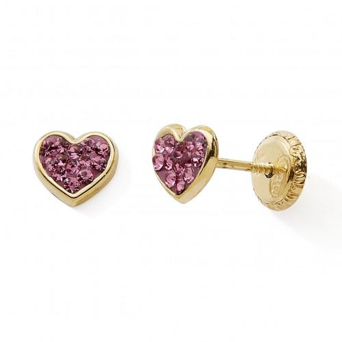Boucles d'oreilles à vis avec motif coeur incrusté de cristaux roses en or jaune 375/1000 (9 carats).