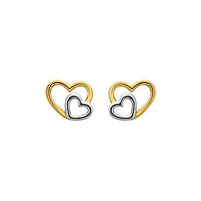 Boucles d'Oreilles Motif Double Cœur en or Bicolore 375/1000 (9 carats) avec fermoir poussettes papillon en or. Idéales pour femme ou jeune fille, 5,70 mm de hauteur et 7,50 mm de longueur. Livraison France métropolitaine offerte. A52922