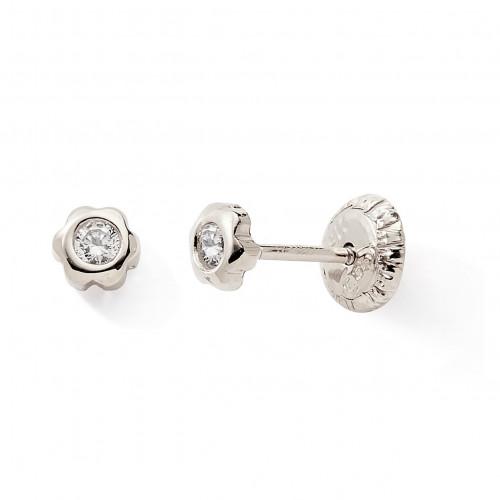 Boucles d'oreilles à visser pour fille, motif fleur serti d'oxyde de zirconium en or gris rhodié 375/1000 (9 carats).