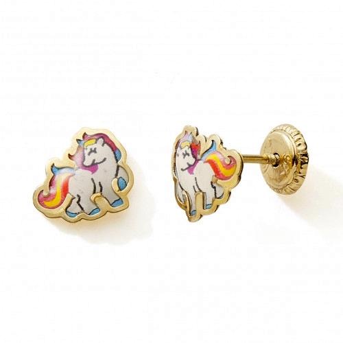 Boucles d'oreilles Licorne fermoirs vissés avec de la laque multicolore pour enfant en or jaune 375/1000 (9 carats).