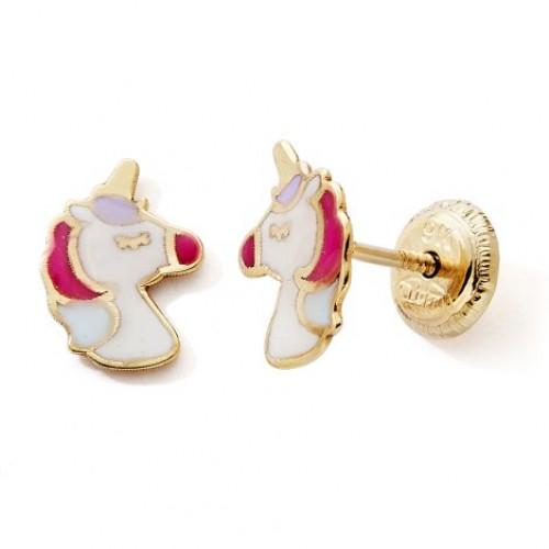 Boucles d'oreilles Licorne fermoirs à vis avec de la laque blanche et rose pour enfant en or jaune 375/1000 (9 carats).