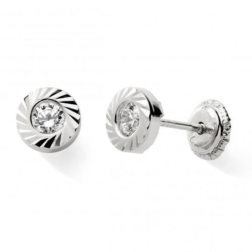 Boucles d'oreilles oxydes de zirconium ronds, serti clos strié, en or gris rhodié 375/1000 (9 carats) avec des fermoirs à vis, pour les enfants et les adultes.