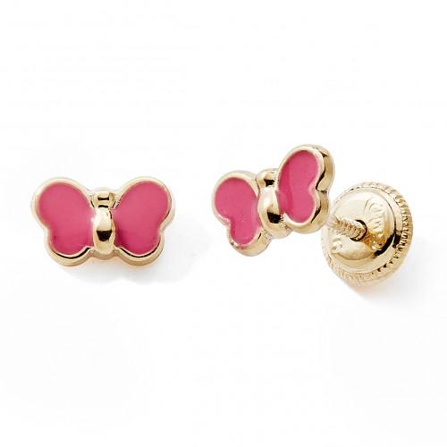 Sympathiques, boucles d'oreilles à vis pour enfant avec un motif papillon laqué rose en or jaune 375/1000 (9 carats).