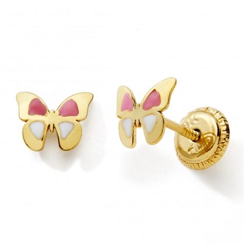 Sympathiques, boucles d'oreilles à vis pour enfant avec un motif papillon laqué rose et blanc en or jaune 375/1000 (9 carats).