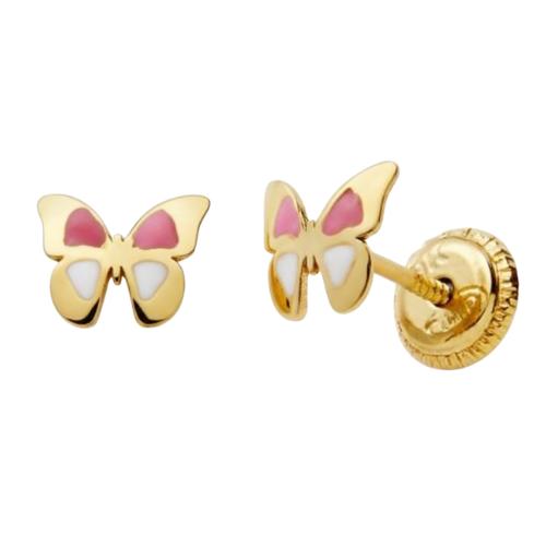 Boucles d'Oreilles à Vis Enfants Motif Papillon Laqué Rose et Blanc en Or Jaune 750/1000 (18 carats).