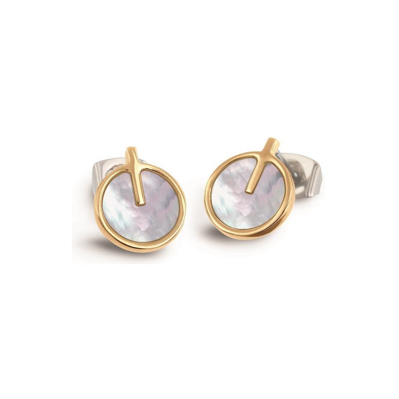 Boucles d'oreilles Boccia rondes en titane plaqué or jaune poli serties de nacre blanche,