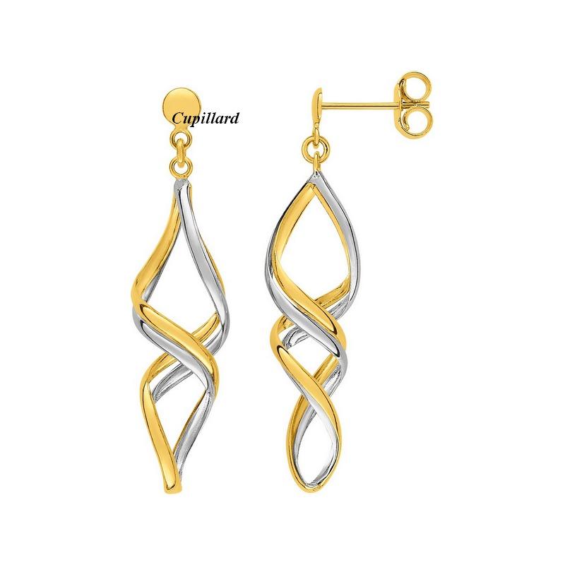 Boucles d'oreilles bicolores torsadées polies en or jaune et gris rhodié 375/1000 (9 carats) pendantes.