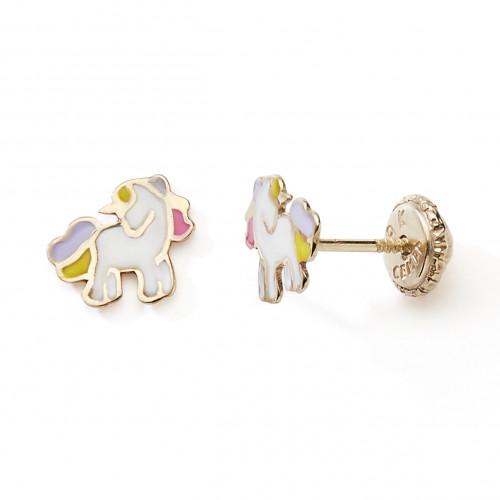 Boucles d'oreilles à vis pour enfant, motif Licorne laque multicolore en or jaune 375/1000 (9 carats).