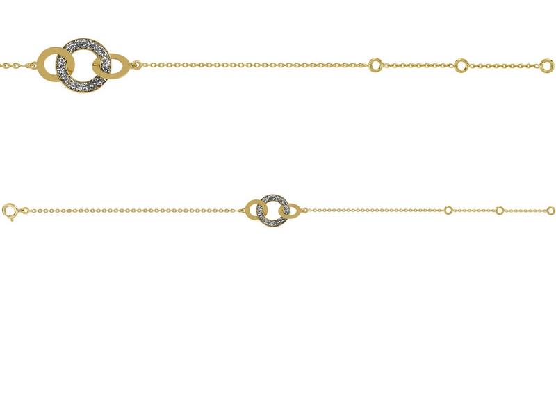 Bracelet femme Cercle simple 11 mm de diamètre en or jaune 375/1000 (9 carats) et 2 cercles de 7,7 mm de diamètre sur une chaine maille forçat massive de 19 cm de longueur avec un anneau intermédiaire à 15,5 cm et 17 cm. (pour une circonférence serrée du poignet de 13,5 - 15 ou 17 cm)