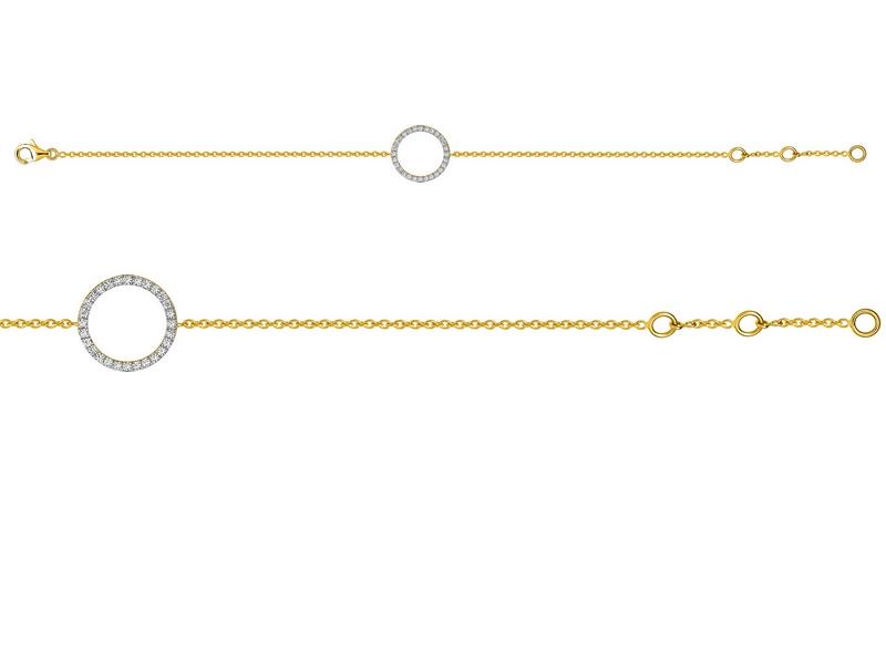 Bracelet Femme Cercle serti de Diamants Naturels (0.14 carats au total) en qualité H-SI en or jaune rhodié 750/1000 (18 carats). Longueur 18 cm avec des anneaux intermédiaires à 15,5 cm et 16,5 cm. Livraison France métropolitaine offerte. 4.6008.23
