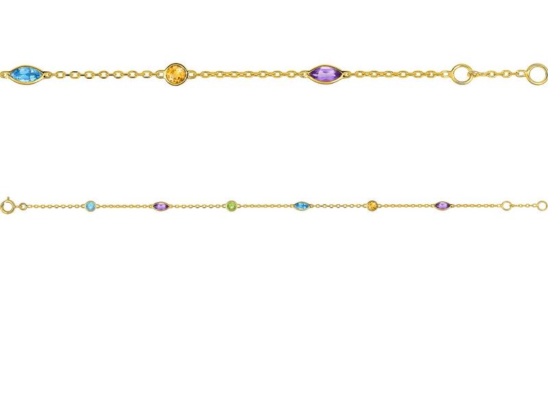 Bracelet fin en or jaune 750/1000 (18 carats) serti de pierres fines : topaze (bleu ciel), améthyste (violet), péridot (vert) et citrine (jaune).