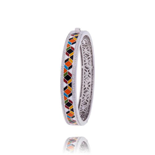 Bracelet Una Storia Siena, jonc rigide (ouvrant avec une charnière à ressort et un cliquet de sécurité sur le coté) en argent rhodié 925/1000 décoré de motif mosaïque en laque multicolore, serti d'oxydes de zirconium.
