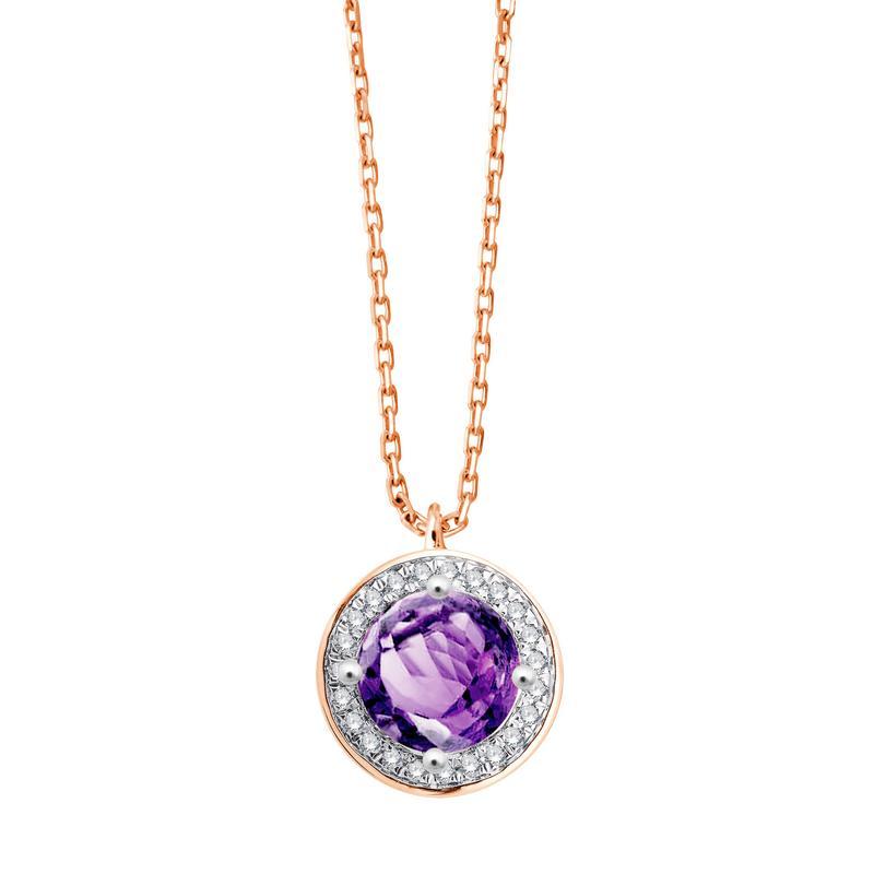 Collier Améthyste ronde de 5 mm de diamètre sur une monture 4 griffes en or rose 750/1000 (18 carats) entourage diamant naturel (0.06 carat au total),