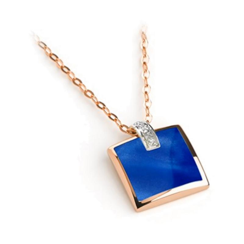 Magnifique collier du créateur Français Alain Clozeau de la ligne Helena, en résine nacrée Bleu de Prusse, serti de diamants naturels (0.03 carat au total) en or rose 750/1000 (18 carats).