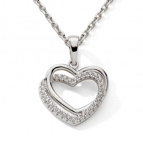 Collier femme en argent 925/1000 rhodié, un coeur argent uni et un cœur pavé d'oxydes de zirconium entrelacés.