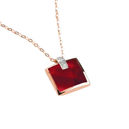 Collier en Or Rose 750/1000 (18 Carats) Signé Alain Clozeau. Issu de la Ligne Héléna, il Associe une Résine Nacrée Rouge Éclatante à un Diamant Naturel Délicatement Serti.