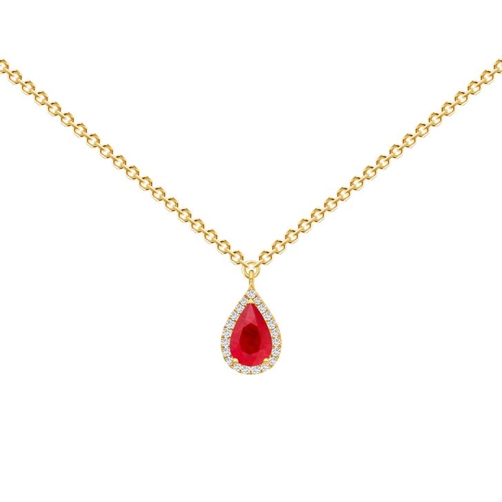 Collier femme en or jaune 750/1000 (18 carats) serti d'un rubis poire 6 mm x 4 mm et de diamants naturels pour 0.08 carat au total. Longueur 42 cm avec un anneau intermédiaire à 40 cm. Livraison offerte France métropolitaine et Corse offerte. 35329.10