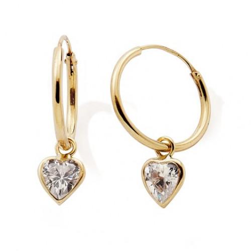 Créoles Or Jaune 375/1000 (9 carats) Pampilles Cœur Zircon. Largeur d'un cœur : 5 mm. Diamètre extérieur d'une créole : 12 mm, Largeur du fil de la créole : 1.2 mm. Vendues à la paire. N11892