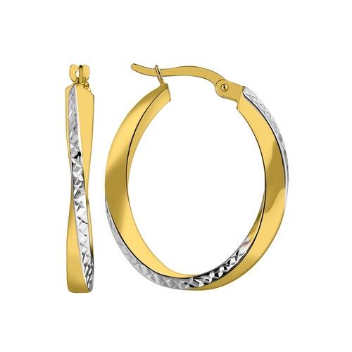 Créoles Torsadées ovales en or bicolore 9 carats (375/1000) avec un fil rectangle 3 x 2 mm de coté. La partie or jaune est lisse et polie, la partie en or gris est ciselée.