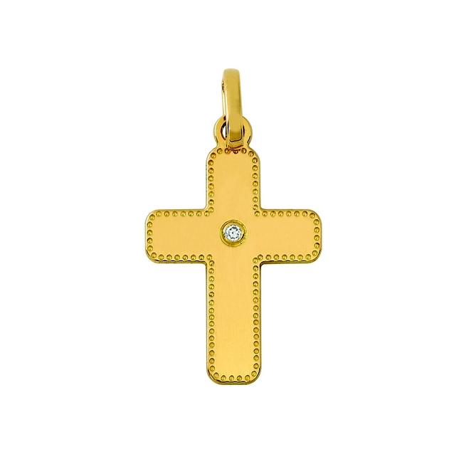 Pendentif croix motif perlé en or jaune 750/1000 (18 carats) sertie d'un diamant naturel pour un poids total de 0.01 carat. Hauteur 15 mm et largeur 11 mm. Livraison France métropolitaine offerte. A18219