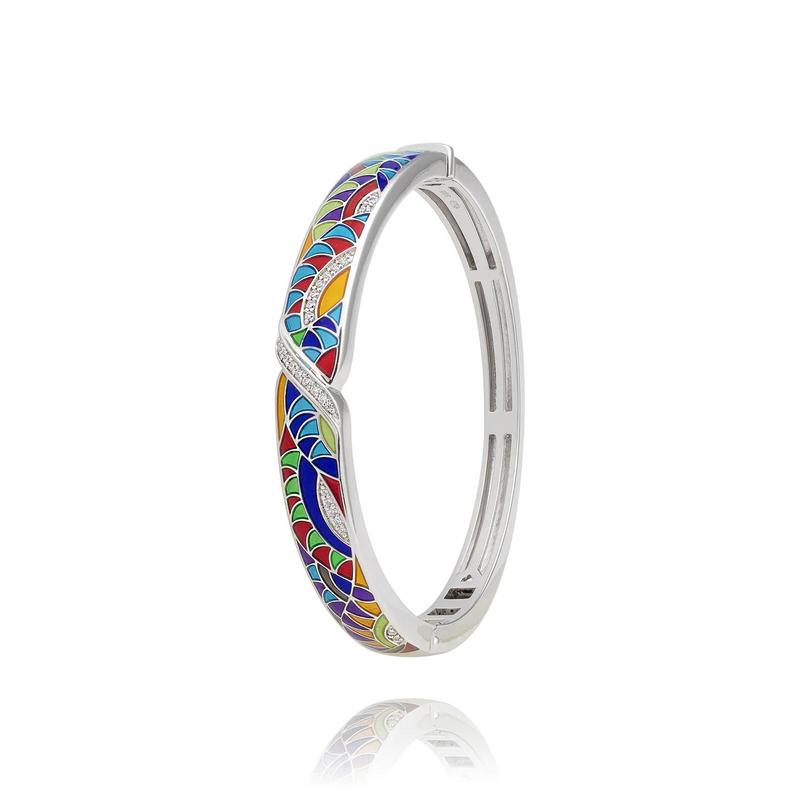 Bracelet Una Storia Riviera jonc ovale rigide (ouvrant avec une charnière sur le coté) pour femme en argent rhodié 925/1000 décoré de motifs en laque multicolore et serti d'oxydes de zirconium.